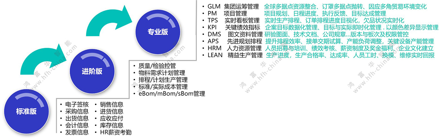 根據(jù)中小企業(yè)不同階段的發(fā)展需要,鴻富華提供可兼容擴(kuò)展的標(biāo)準(zhǔn)、進(jìn)階與專業(yè)版數(shù)字化管理系統(tǒng),實(shí)現(xiàn)系統(tǒng)的快速、低成本升級(jí)。根據(jù)企業(yè)的需要,各模塊也可在數(shù)字化管理平臺(tái)基礎(chǔ)上,獨(dú)立組合及延展為MES、WMS等高階專業(yè)軟件,原有數(shù)據(jù)可實(shí)現(xiàn)快速的共享與導(dǎo)入/導(dǎo)出。鴻富華中小企業(yè)數(shù)字化管理平臺(tái),既滿足企業(yè)發(fā)展初期的需要,也能兼顧企業(yè)發(fā)展中后期的升級(jí)需求。